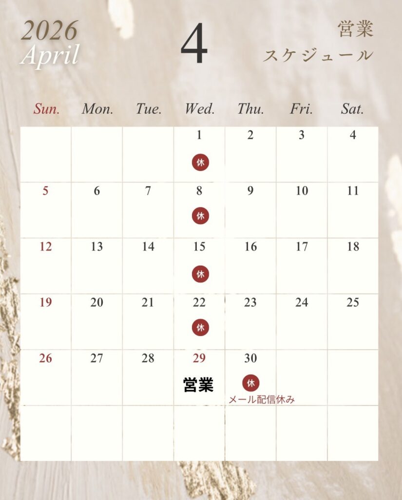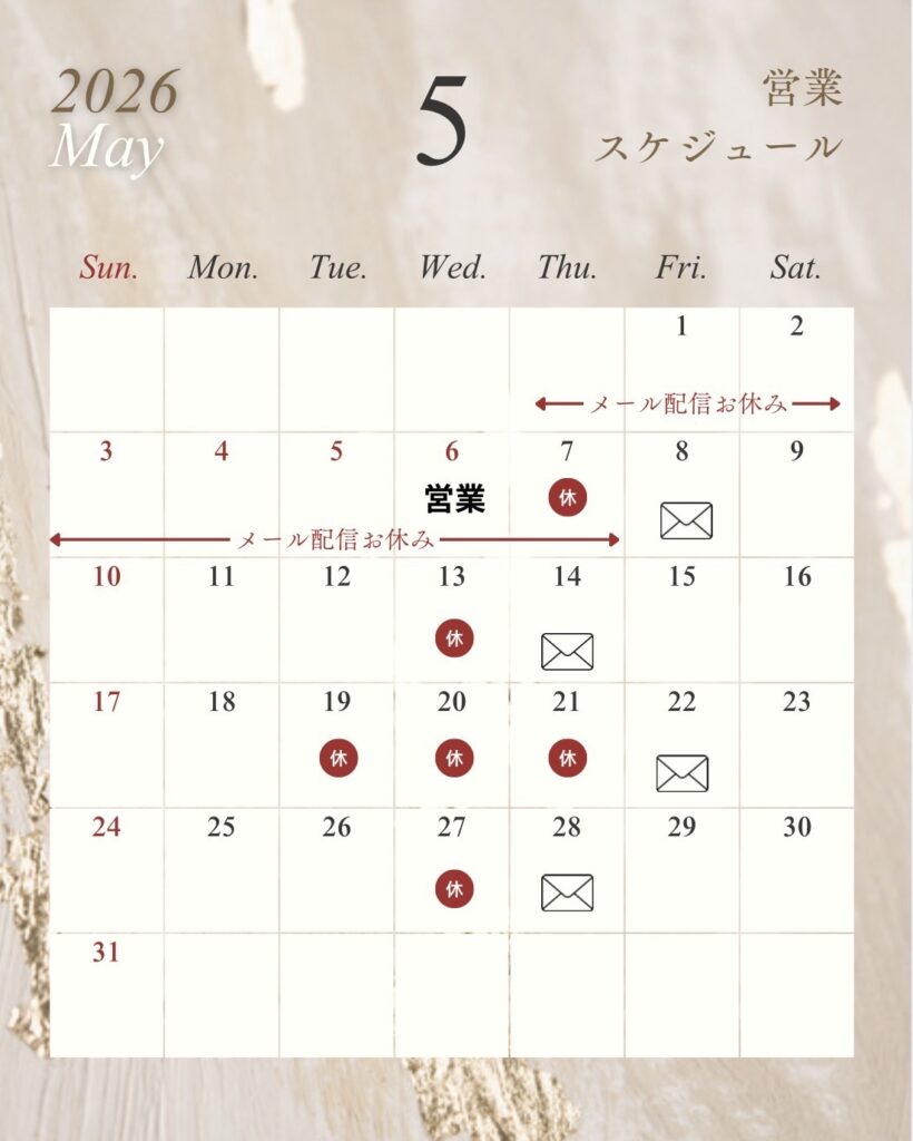 2026年4月・5月の営業カレンダー 不定期なお休みがございます。 ご確認の上、ご予約をお願い致します。 ゴールデン...
